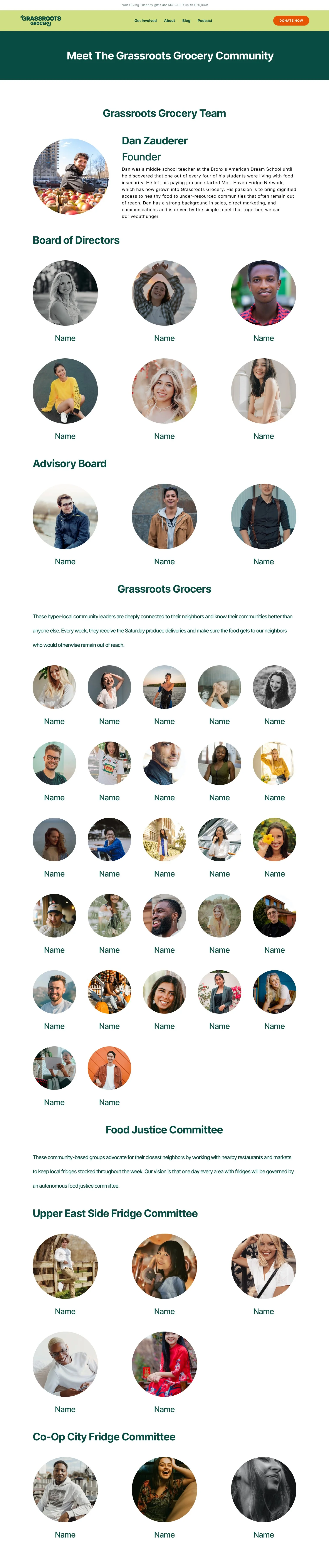 This single page layout would allow potential volunteers to more easily inform themselves about Grassroots Grocery, while also reinforcing the community-based aspect of GG by showing all its members together .