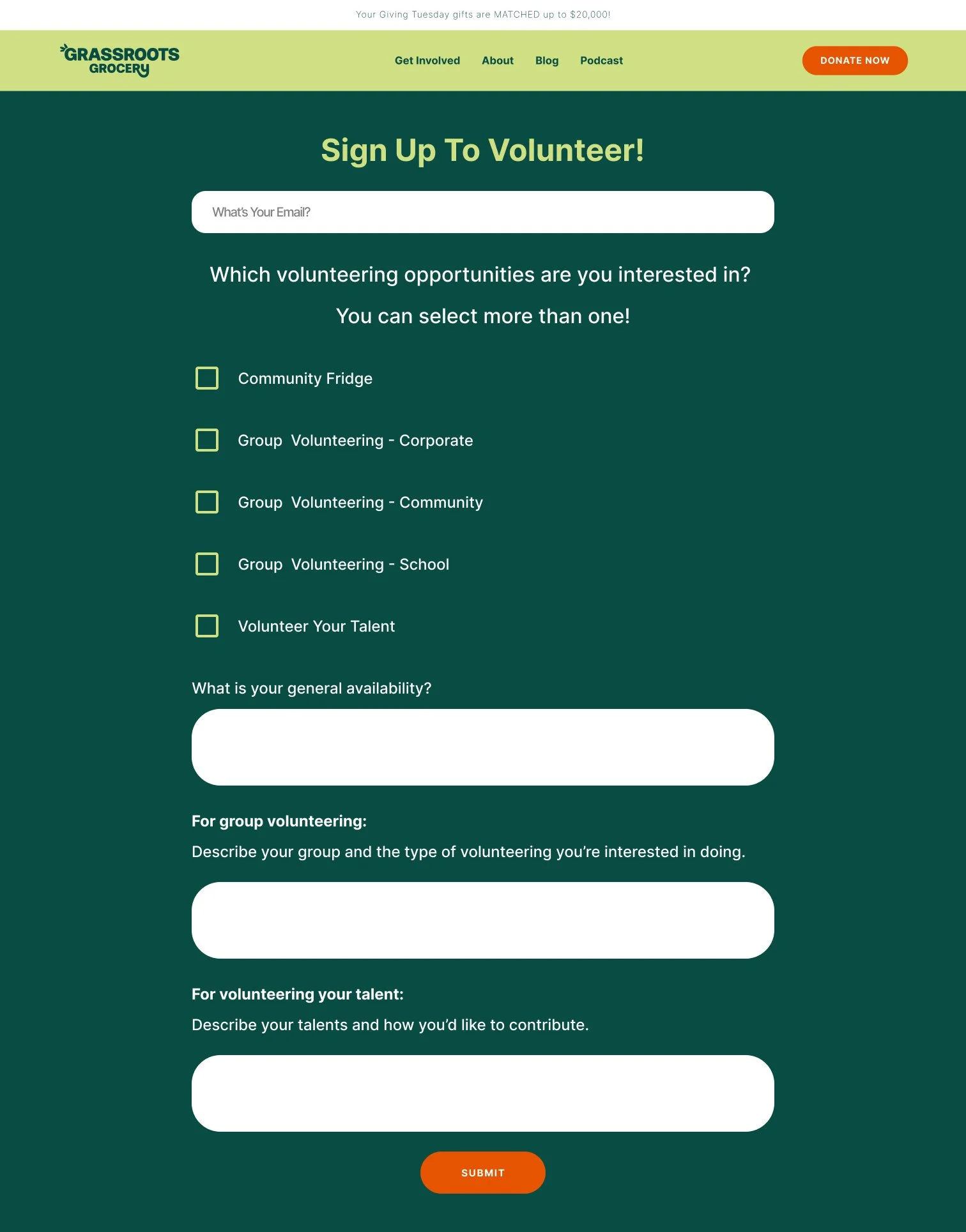 Single page with all volunteer opportunities clearly listed, accessed by clicking “get involved” in the nav bar.