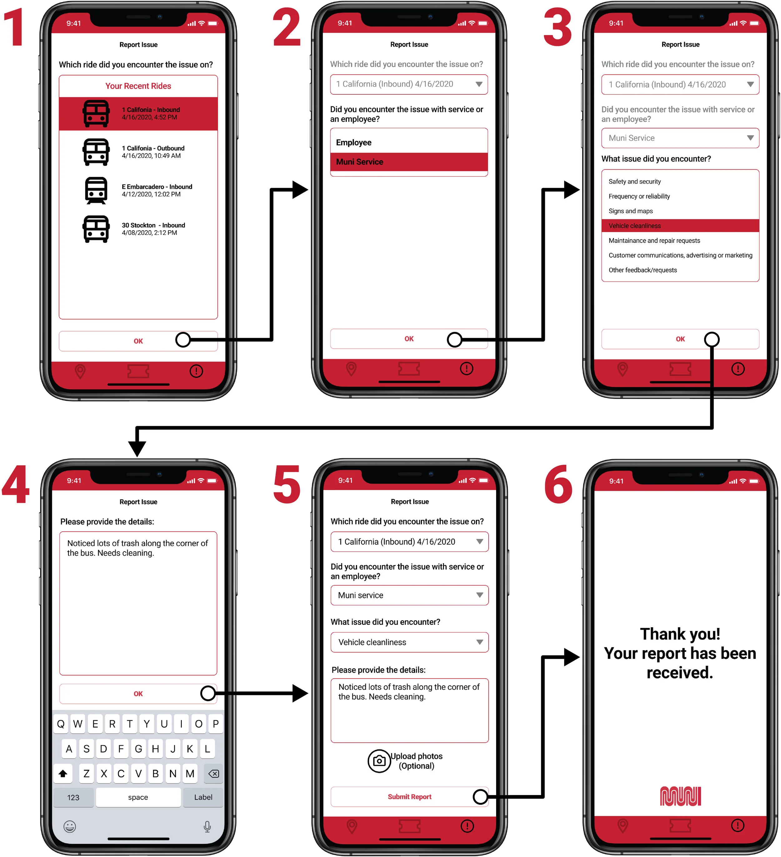 The user simply needs to fill out a simple for and upload a picture if necessary. The feedback will help Muni pinpoint opportunities to improve their service, which benefits the rider and gives them an opportunity to have their voice be heard.